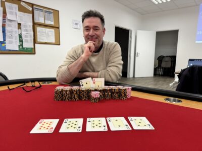 Dès la 2eme main, Sylvain s’est délesté de 80 points pour caver une seconde fois ! On a vu pas mal d’horreurs sur la river, et des bad beats à faire péter les plombs !