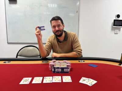 Laurent démarre la confrontation avec 60% des jetons, et ne laisserai aucune chance à son adversaire, qui sera sa 10eme victime de la soirée.